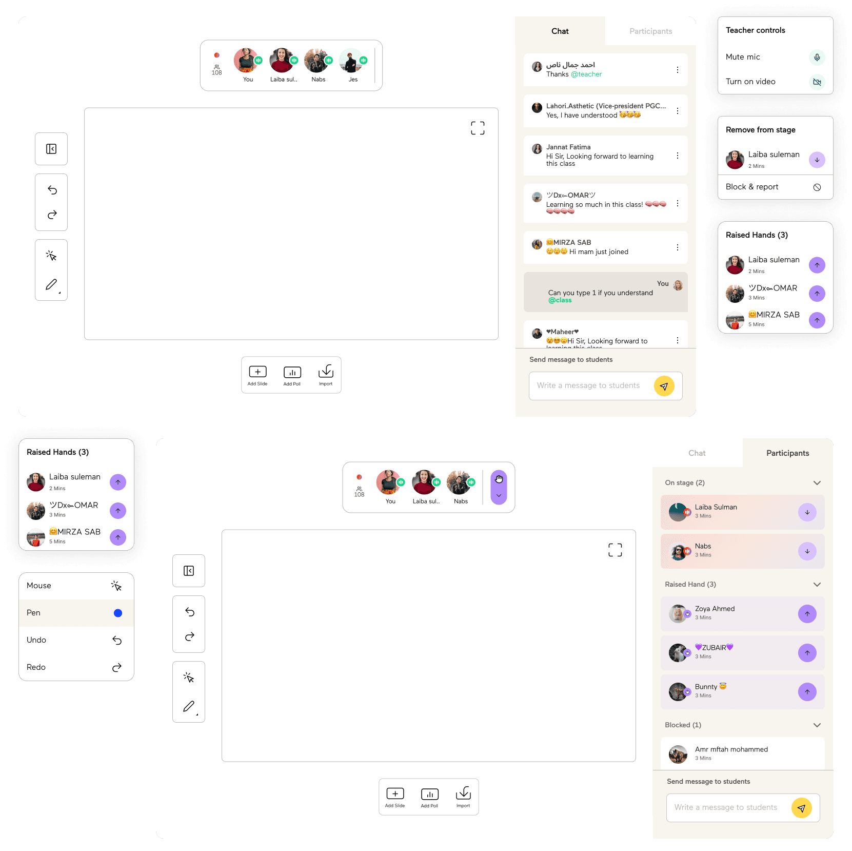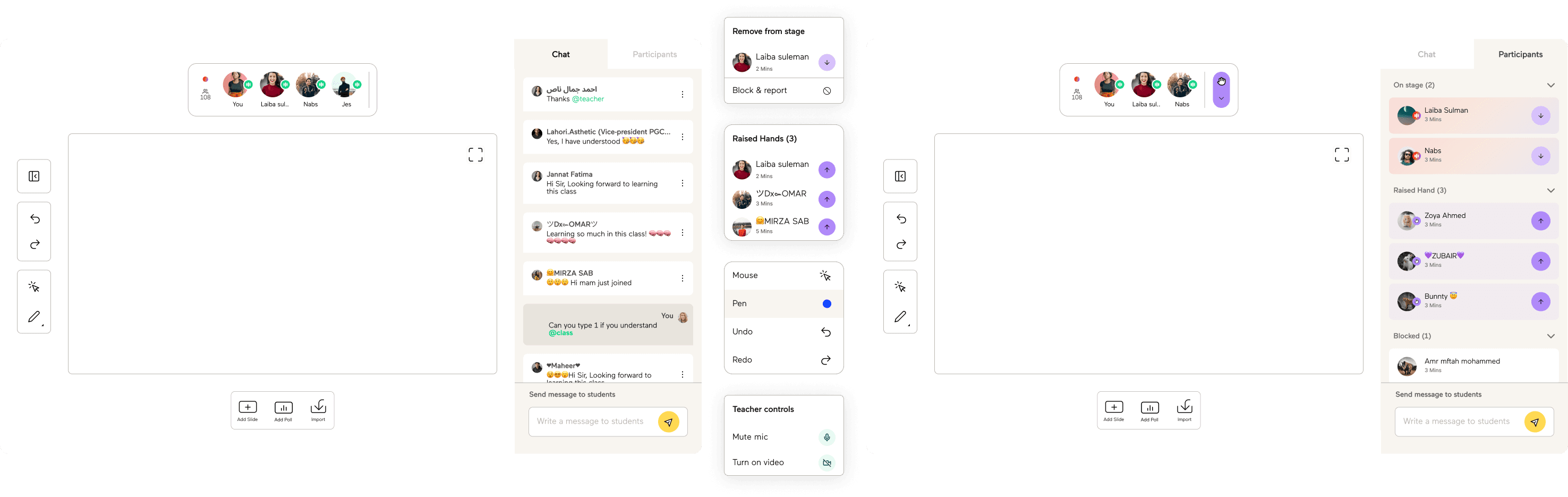 On the teacher's side, the main issue was centered around visibility and feedback. Teachers had no clear indication if students were actively engaged unless they typed something in the chat. More importantly, there was no way to easily identify which student wanted to ask a question or speak during the session. This lack of real-time feedback and visibility made it difficult for teachers to manage engagement and participation effectively.