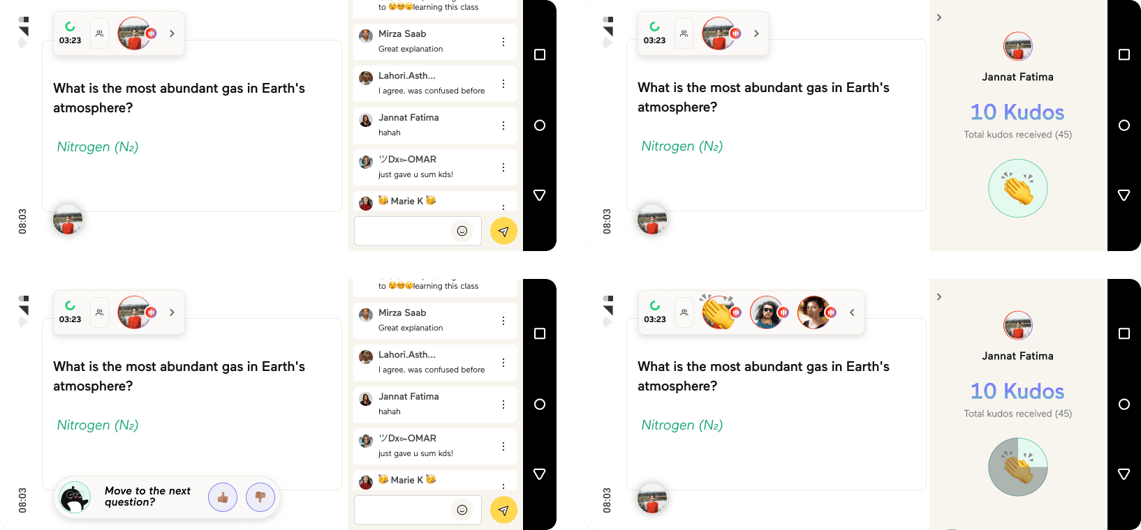 The feature centered on student panels and live discussions on curated questions. Participants could interact with panelists via chat or give Kudos for valuable contributions, ensuring active engagement and feedback. The challenge here was how to integrate this new feature into the app's existing live class product.