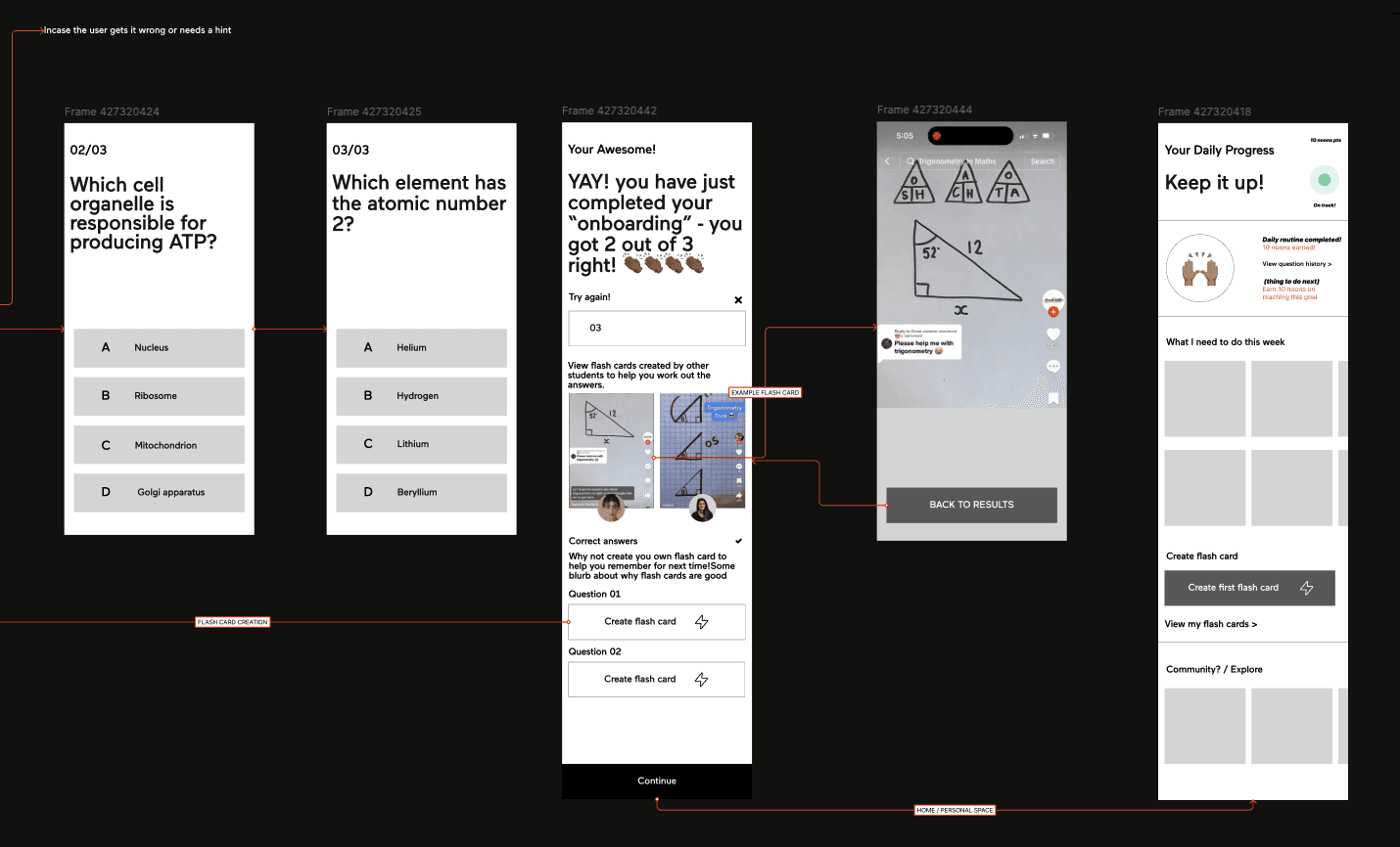 One of the initial concepts was to enable students to save questions they encountered as digital flash cards, which could be shared within their academic community. While some students were enthusiastic about this idea, most found the process of creating and sharing flash cards too complex and burdensome.
